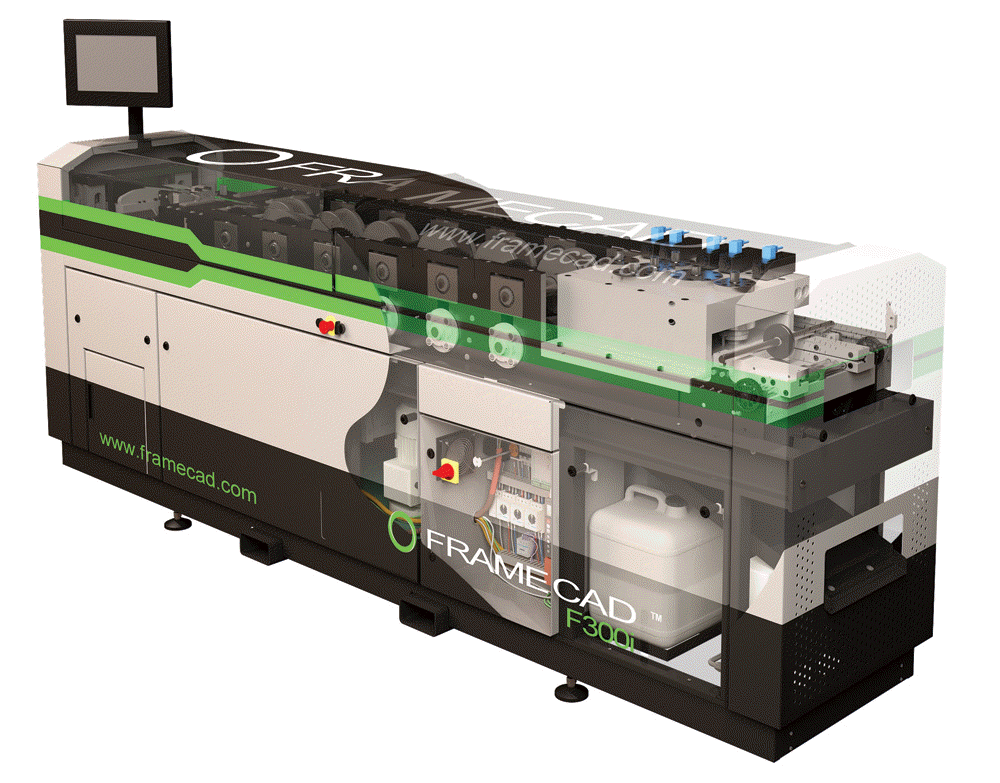FRAMECAD F300i/315i Steel Stud and Paneling Equipment- With the input of the design, each piece is made to specifications and labeled for identification.